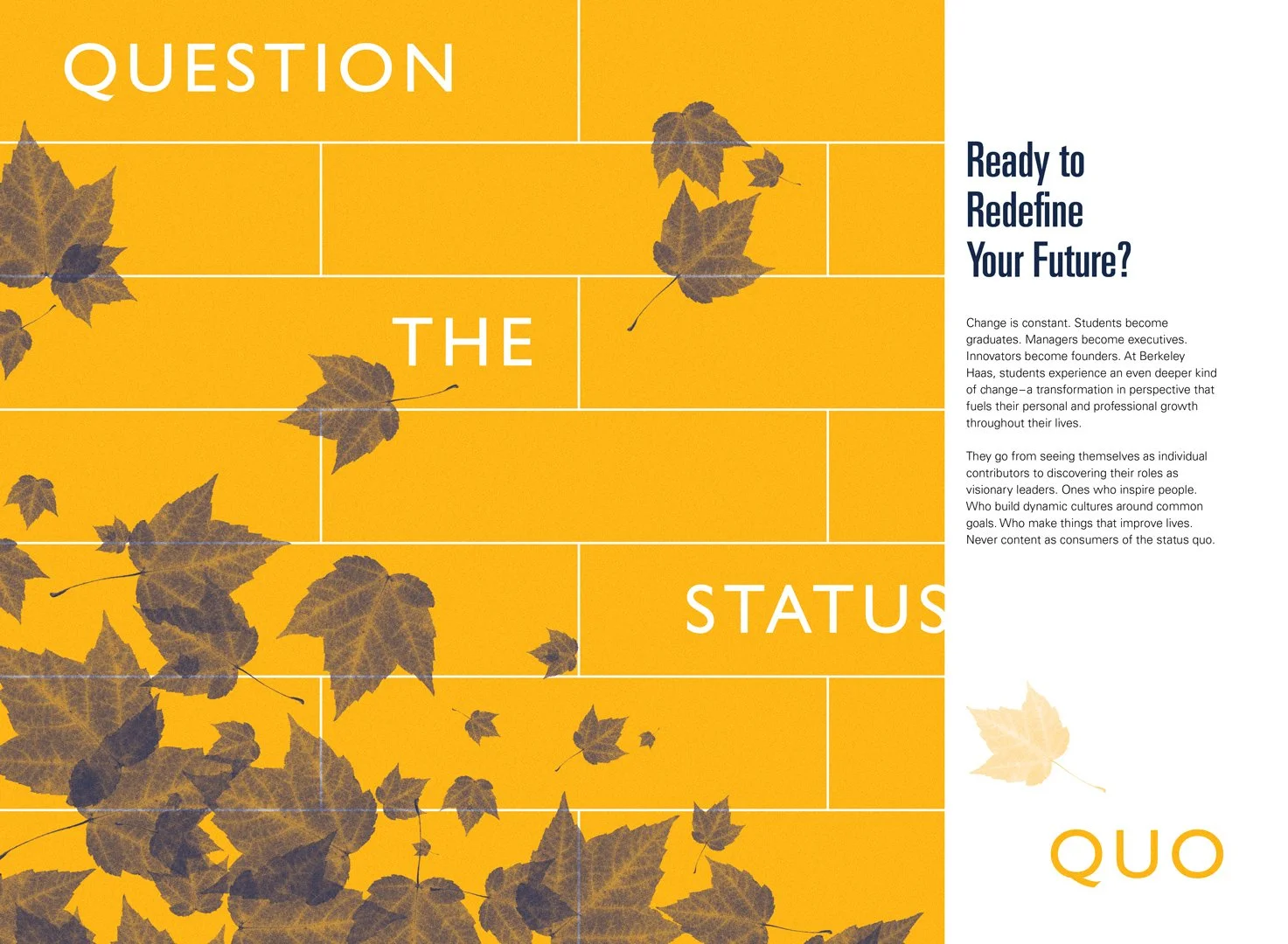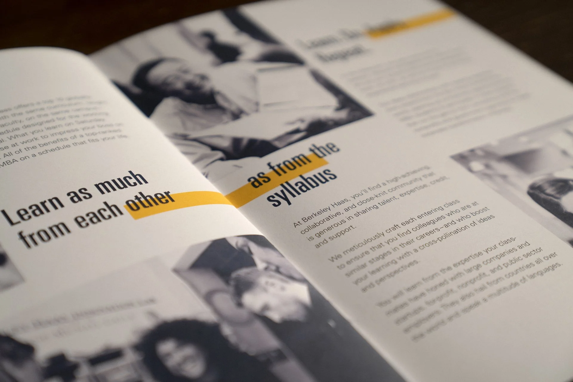 BerkeleyHaas was determined to break away from the conventional MBA program brochure. Their goal was to embody Berkeley's lively spirit, dynamic atmosphere, confidence, cutting-edge culture, and unique offbeat character.